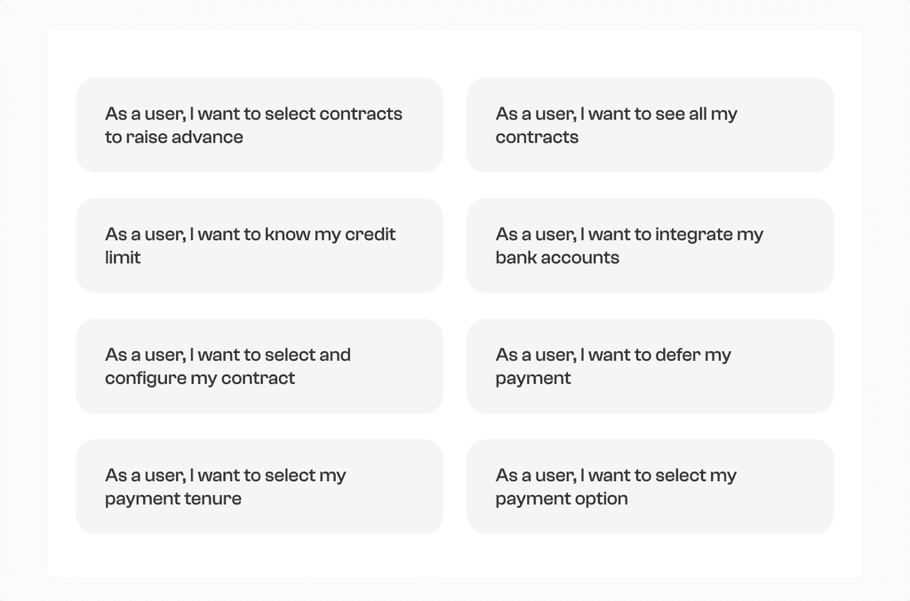 I and fellow designer along with the product manager framed bite-sized user stories to start wireframing. This helped to build context in terms of the job the user is trying to get done in each stage.