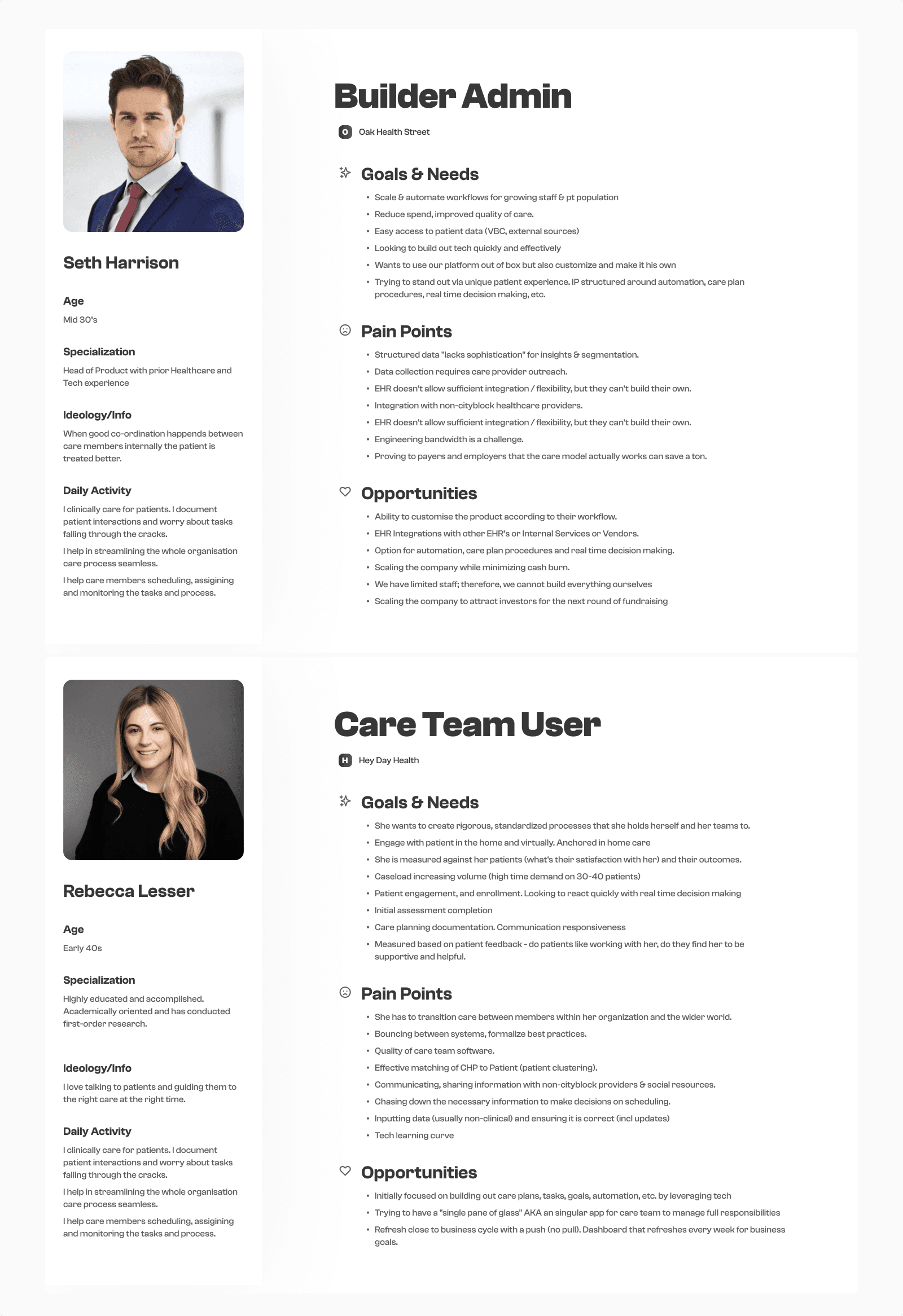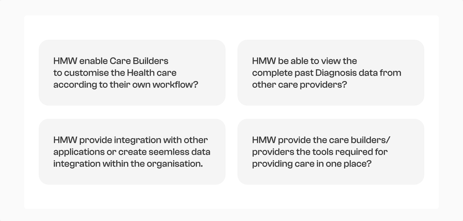For the MVP, we have taken a path that addresses the How might we’s mentioned above faced by Care Builders, Providers, and Patients.